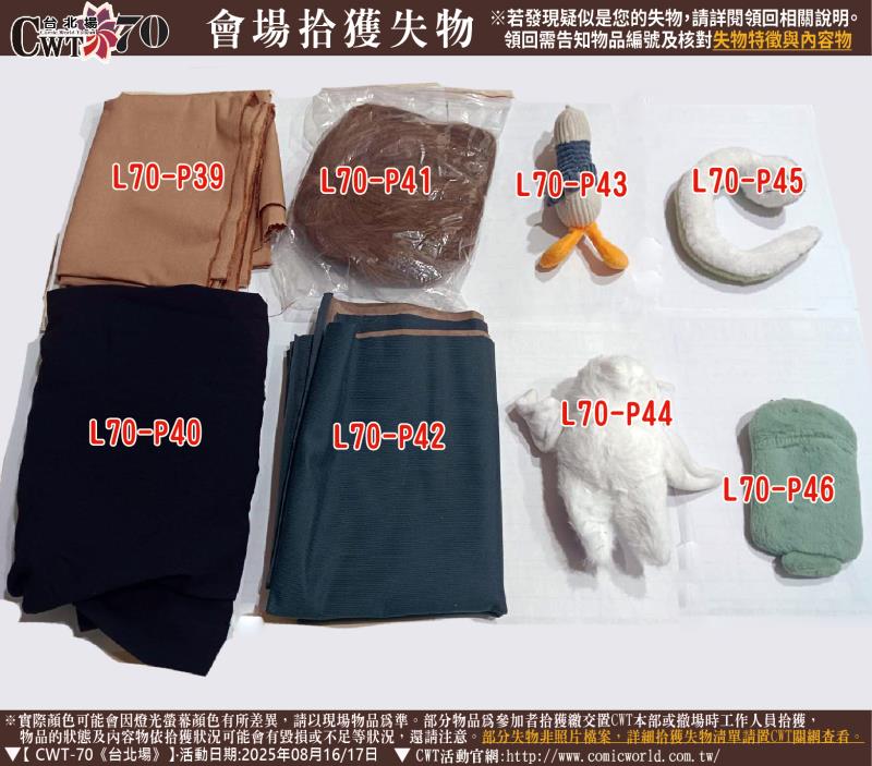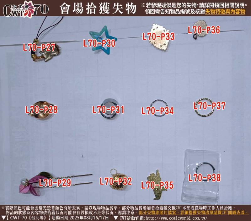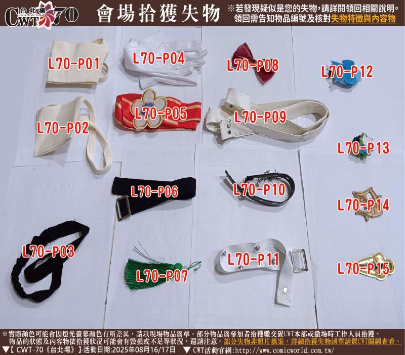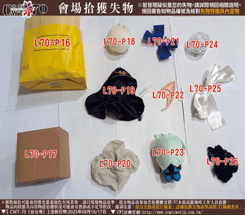 【失物僅保留一年】 若有同好在物品清單及照片中,發現疑似屬於您的失物,請在公告後一年內依規定方式與CWT工作小組聯絡。| 聯絡信箱:CWT@comicworld.com.tw |